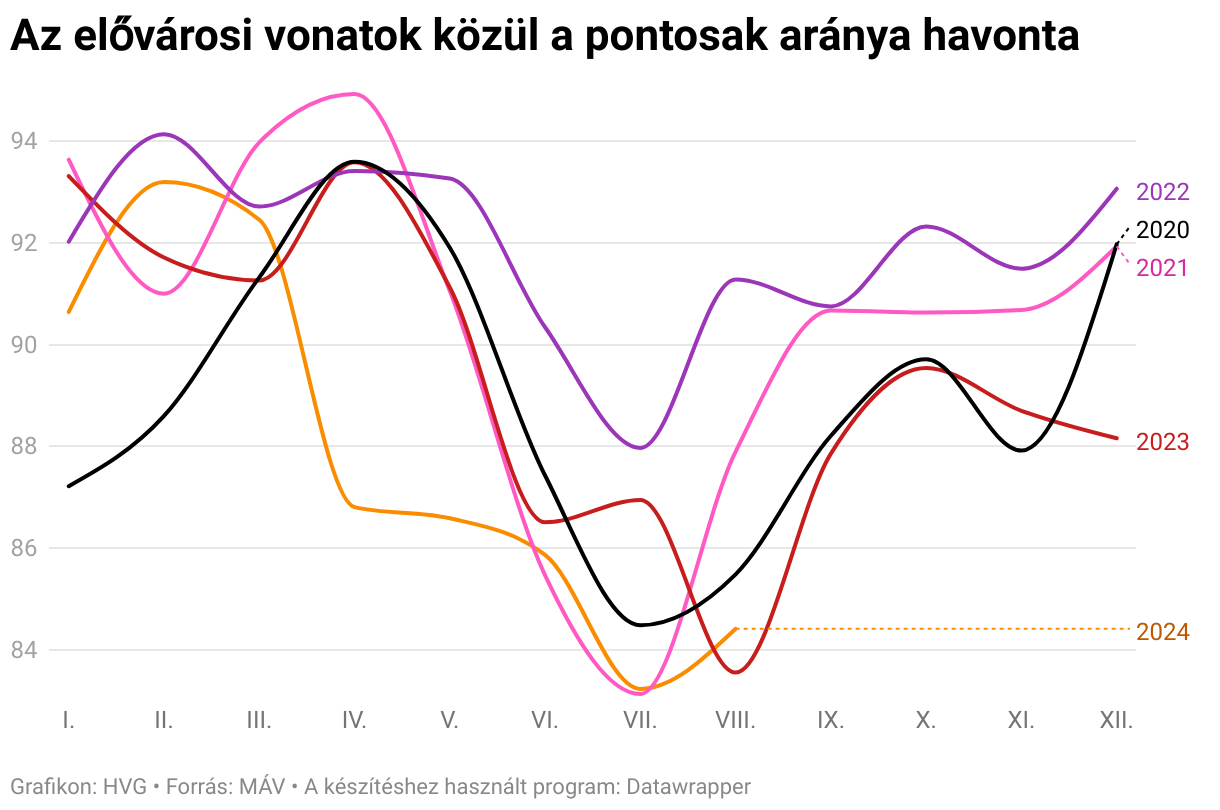 Az elővárosi vonatok közül a pontosak aránya havonta