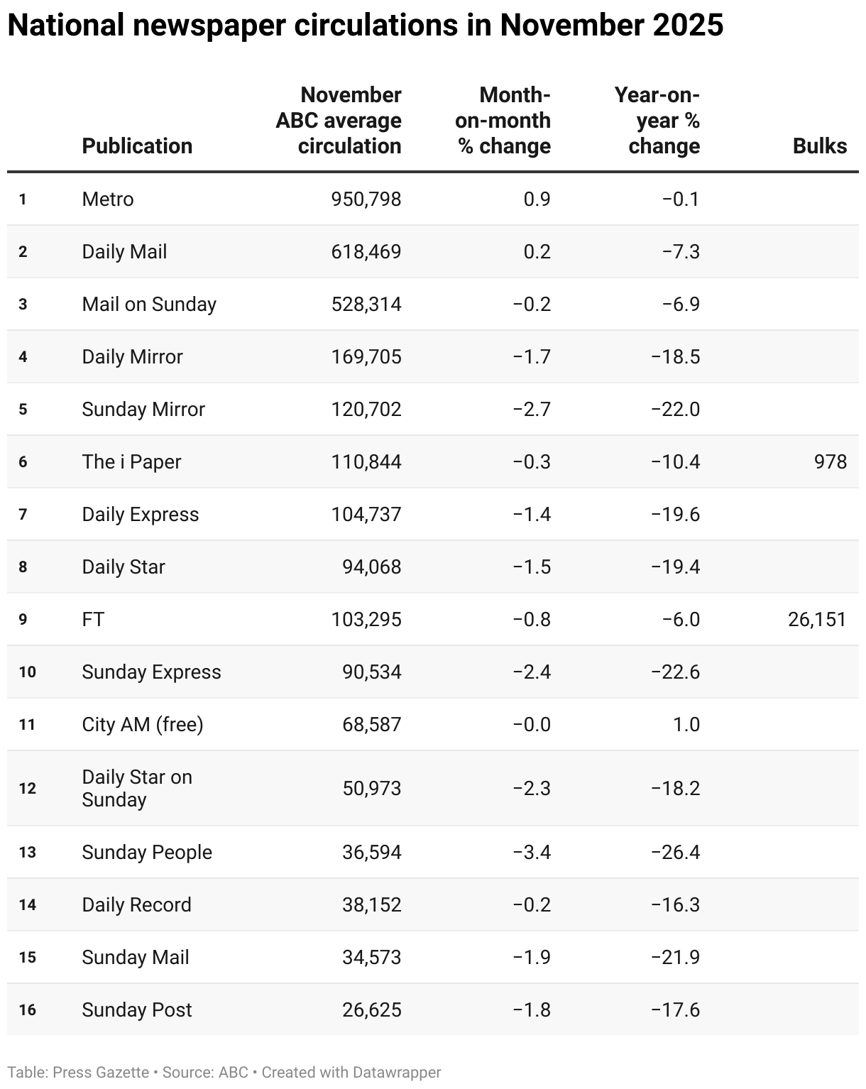 National newspaper circulations in November 2025