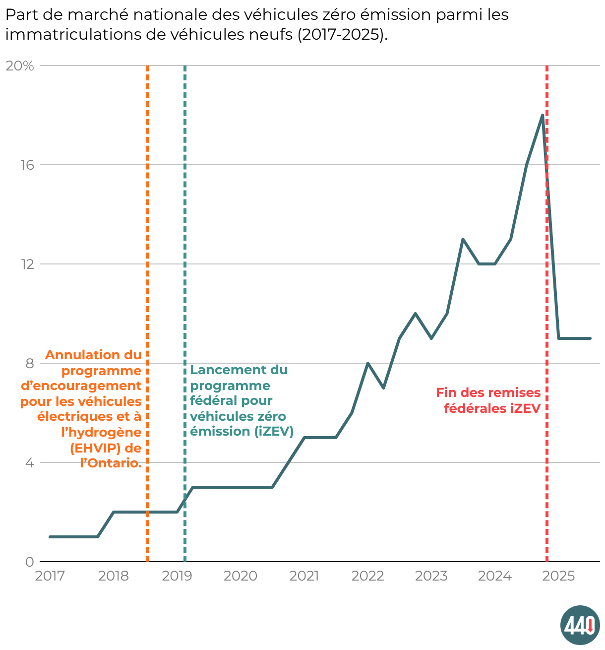 Part de marché nationale des véhicules zéro émission parmi les immatriculations de véhicules neufs (2017-2025).