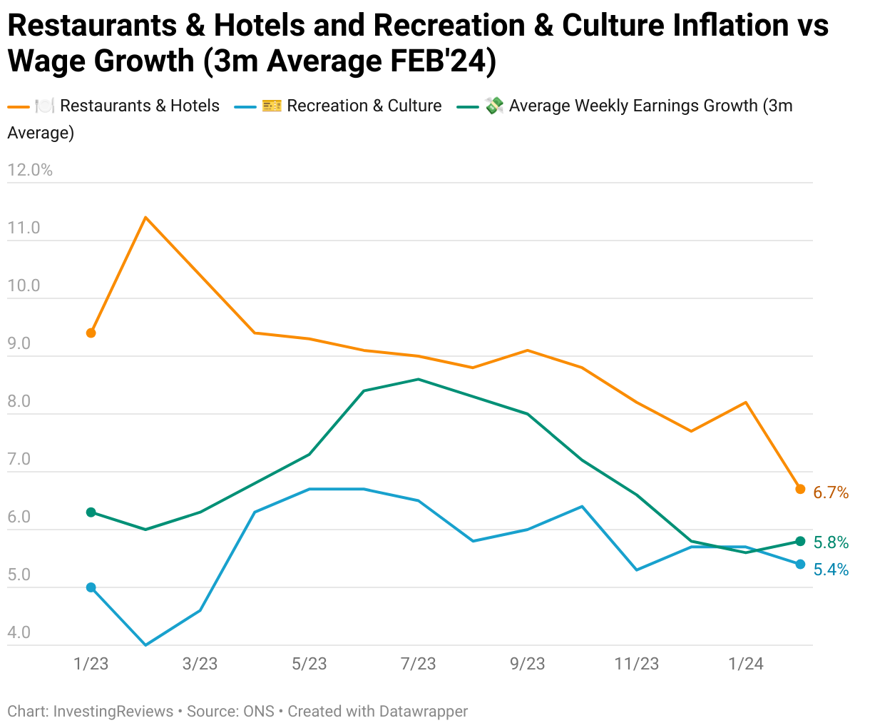 Restaurants & Hotels and Recreation & Culture Inflation vs Wage Growth (3m Average FEB'24)