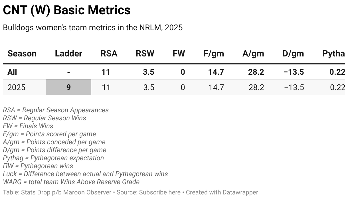 Bulldogs women's team metrics in the NRLM, 2025