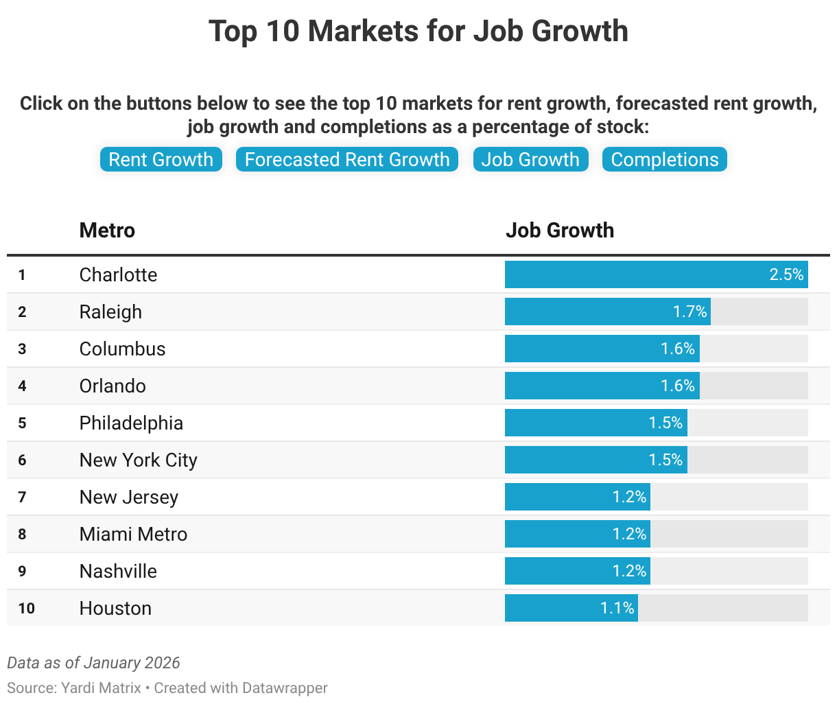 Click on the buttons below to see the top 10 markets for rent growth, forecasted rent growth, job growth and completions as a percentage of stock: