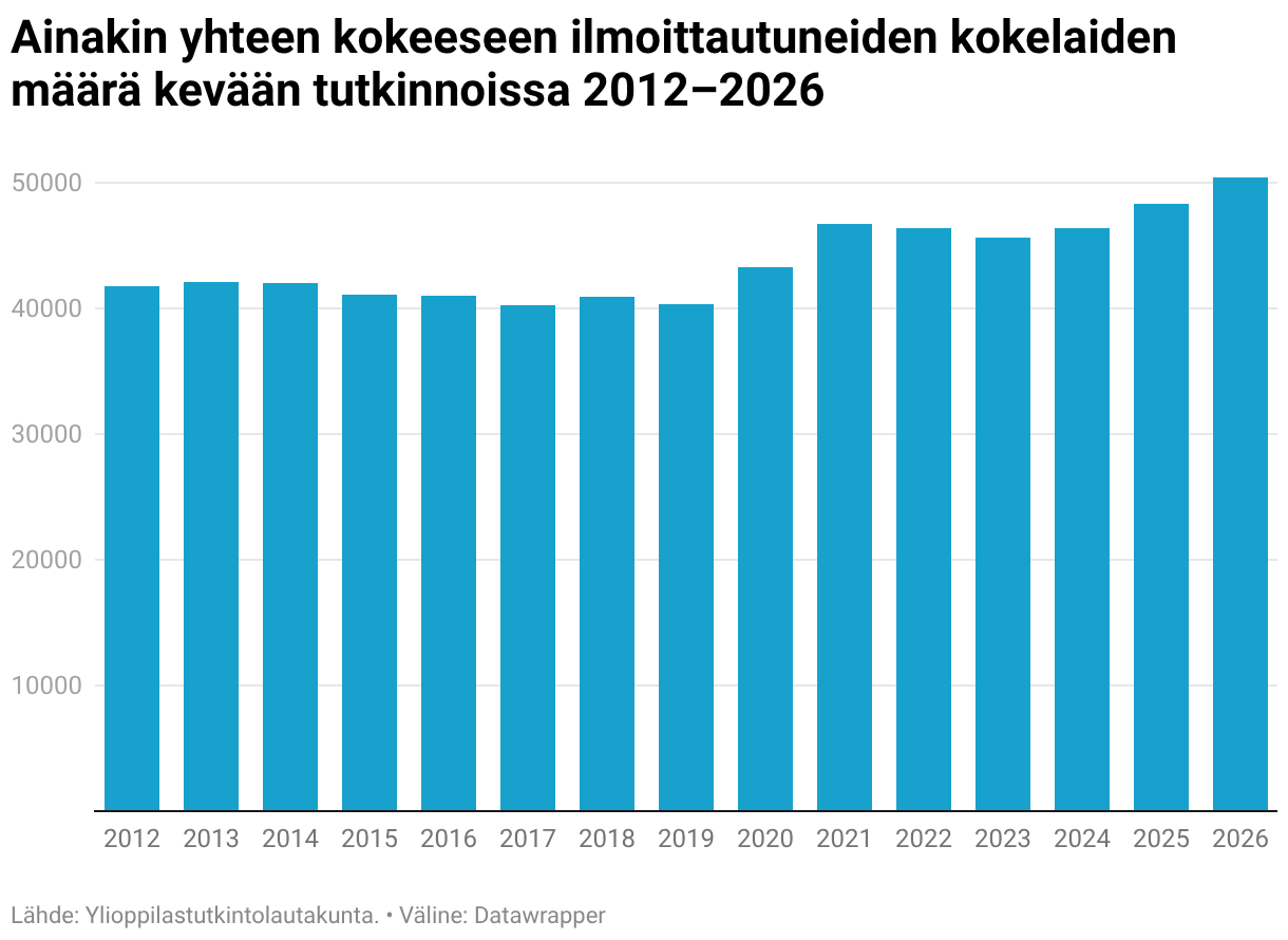 Ainakin yhteen kokeeseen ilmoittautuneiden kokelaiden määrä kevään tutkinnoissa 2012–2026