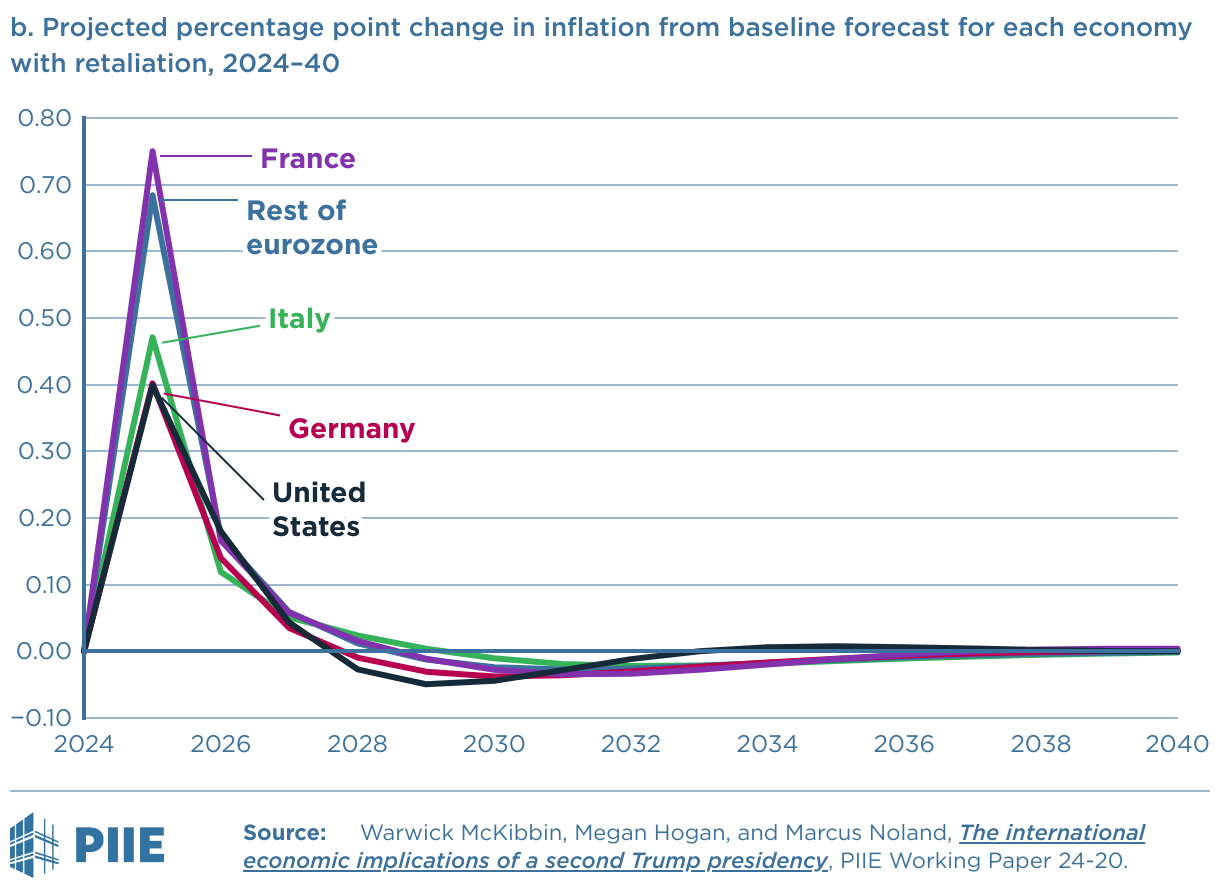 b. Projected percentage point change in inflation from baseline forecast for each economy with retaliation, 2024–40