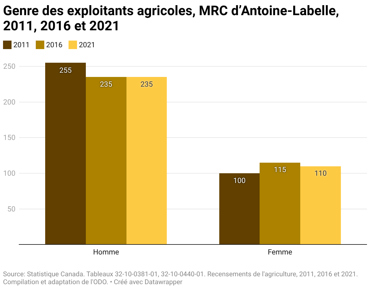 Genre des exploitants agricoles, MRC d’Antoine-Labelle, 2011, 2016 et 2021