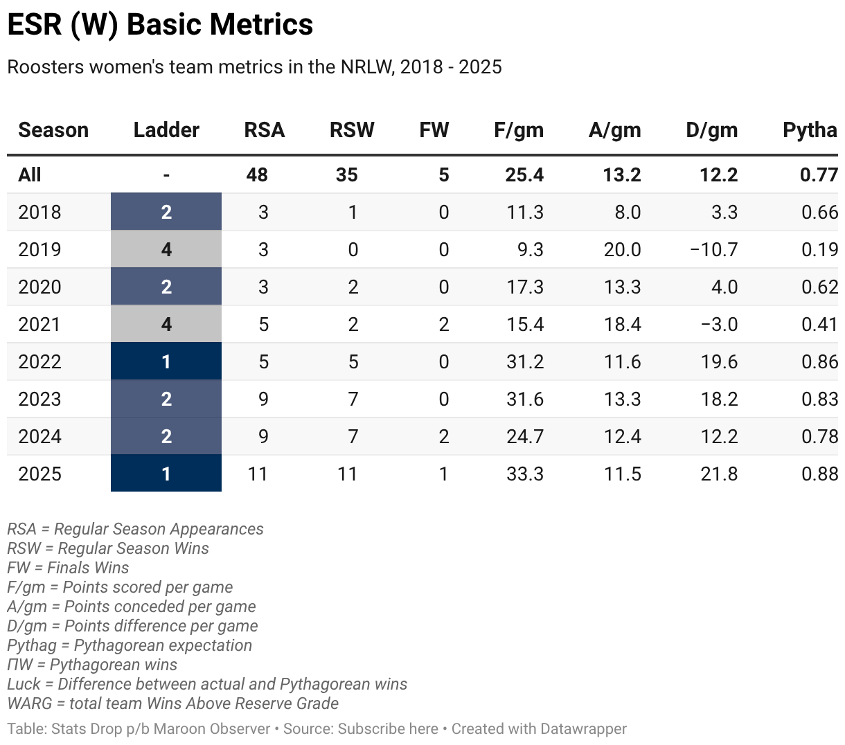 Roosters women's team metrics in the NRLW, 2018 - 2025
