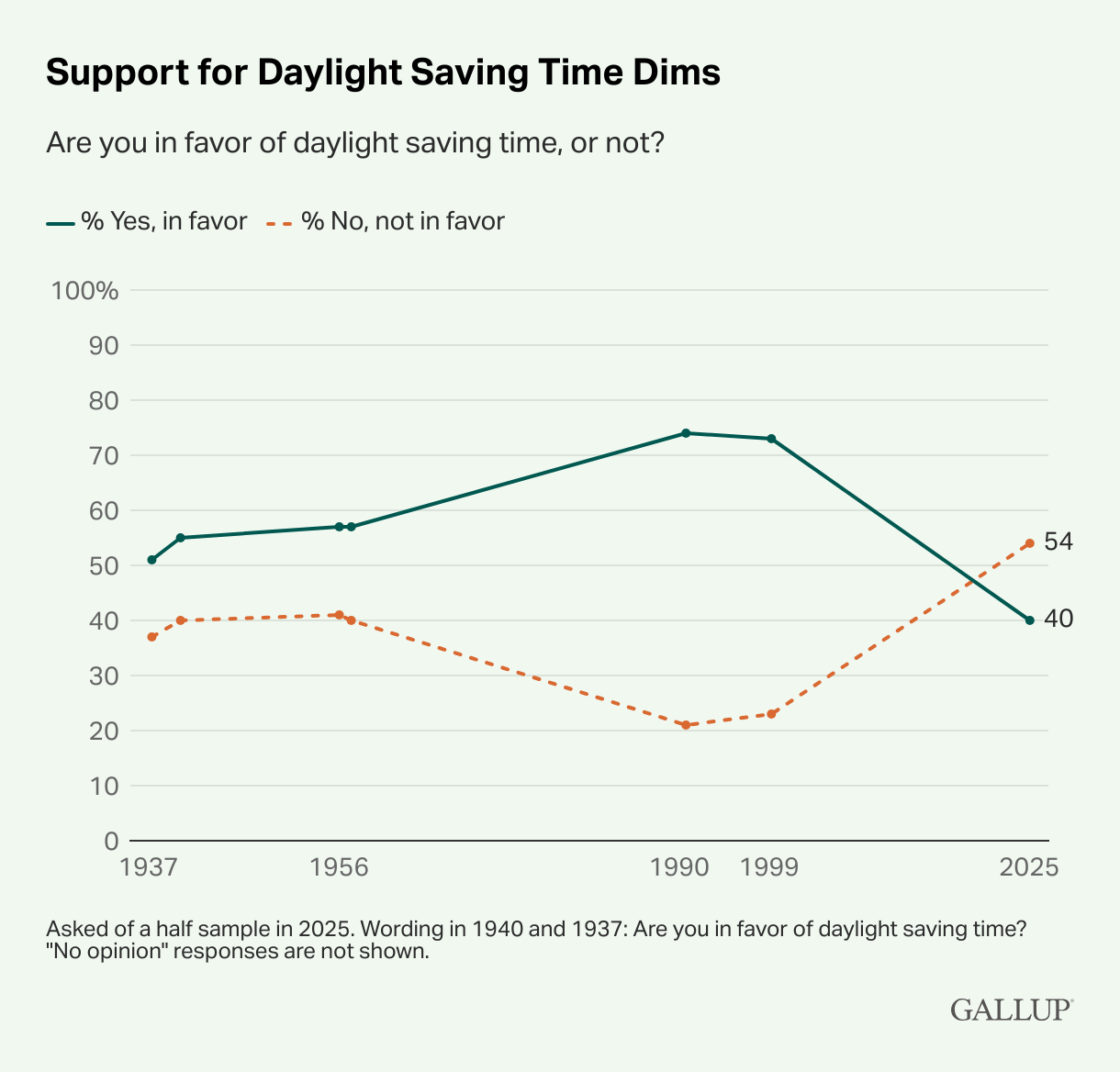 The line chart titled "Support for Daylight Saving Time" tracks public opinion on daylight saving time from 1937 to 2025, showing the percentage of Americans in favor and opposed. The solid teal line represents those in favor, while the dotted orange line represents those opposed. Support peaked around the 1990s at over 70% but declined sharply in the 2025 poll, the next time Gallup asked about it, reaching 40%. Opposition followed an inverse trend, declining to around 20% in the 1990s before moving to the majority level, 54%, in 2025. The latest data suggest a significant shift in public opinion, with more Americans now opposing daylight saving time than supporting it.