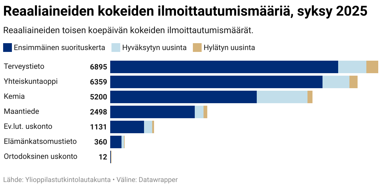 Reaaliaineiden toisen koepäivän kokeiden ilmoittautumismäärät.