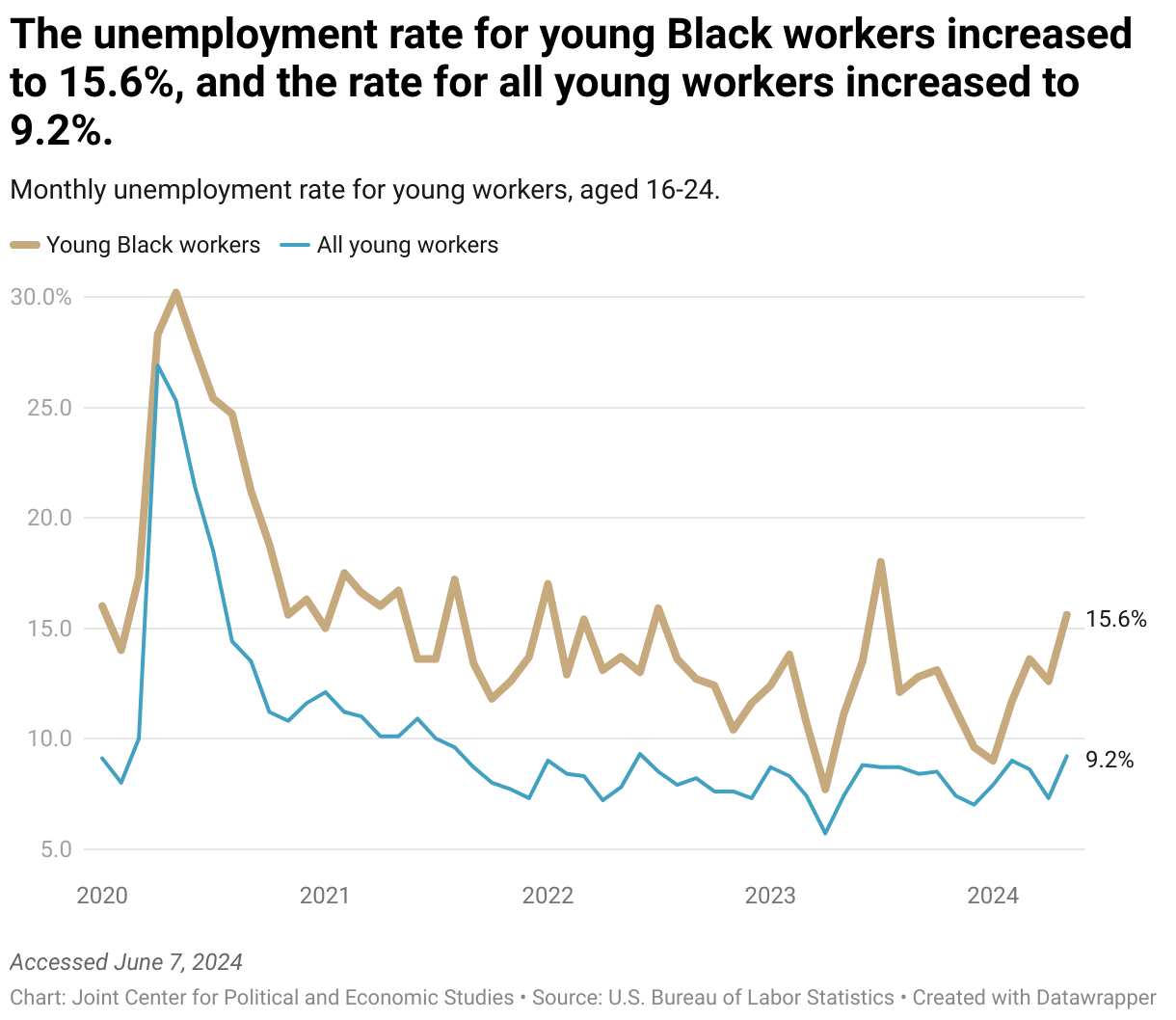 Monthly unemployment rate for young workers, aged 16-24.