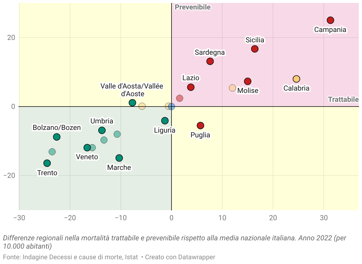 Differenze regionali nella mortalità trattabile e prevenibile rispetto alla media nazionale italiana. Anno 2022 (per 10.000 abitanti)