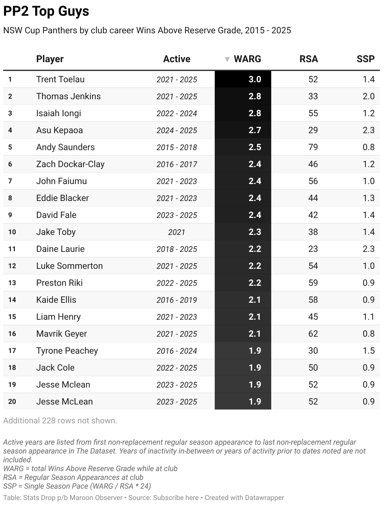 NSW Cup Panthers by club career Wins Above Reserve Grade, 2015 - 2025