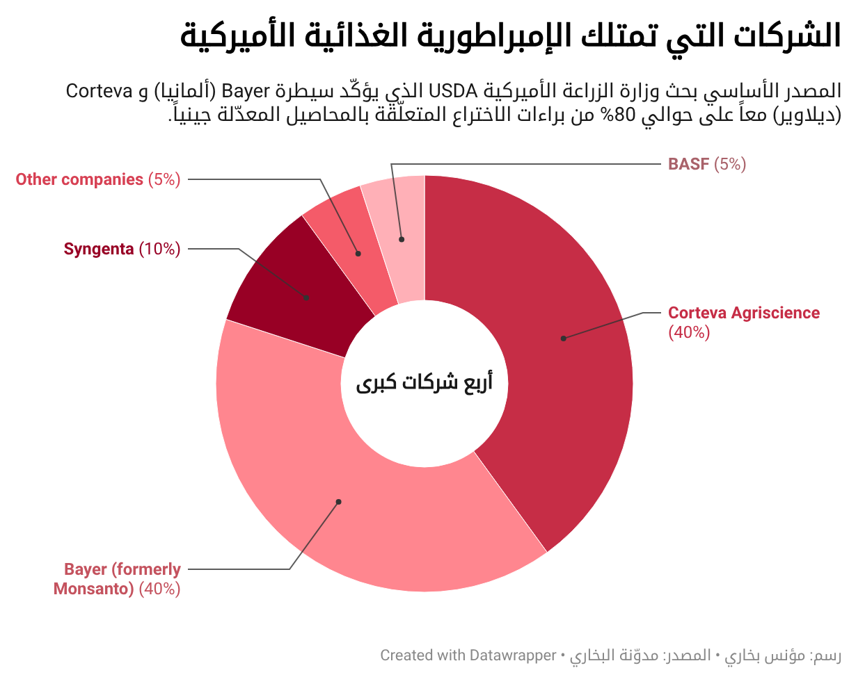 المصدر الأساسي بحث وزارة الزراعة الأميركية USDA الذي يؤكّد سيطرة Bayer (ألمانيا) و Corteva (ديلاوير) معاً على حوالي 80% من براءات الاختراع المتعلّقة بالمحاصيل المعدّلة جينياً.