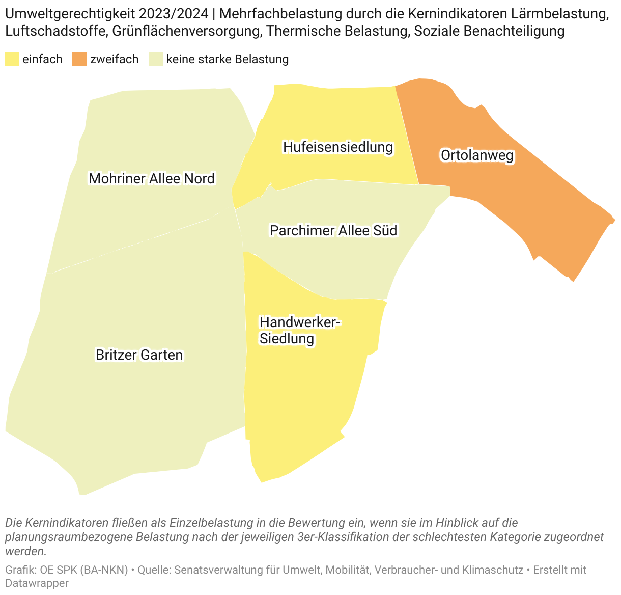 Umweltgerechtigkeit 2023/2024 | Mehrfachbelastung durch die Kernindikatoren Lärmbelastung, Luftschadstoffe, Grünflächenversorgung, Thermische Belastung, Soziale Benachteiligung