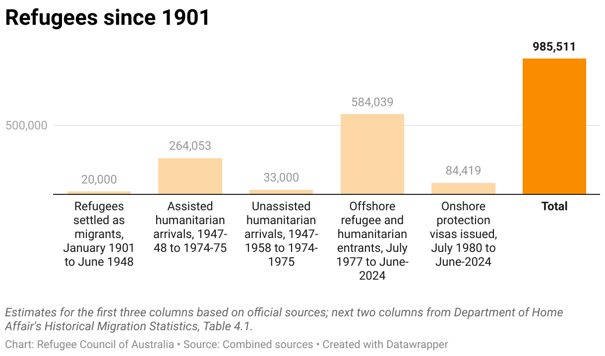 Column chart showing 20,000 refugees settled as migrants to 1948, an estimate of 264,053 assisted humanitarian arrivals until 1975 and another 33,000 unassisted, and offshore humanitarian entrants of 584039 and onshore protection visas of 84419 and a total figure of 985511.