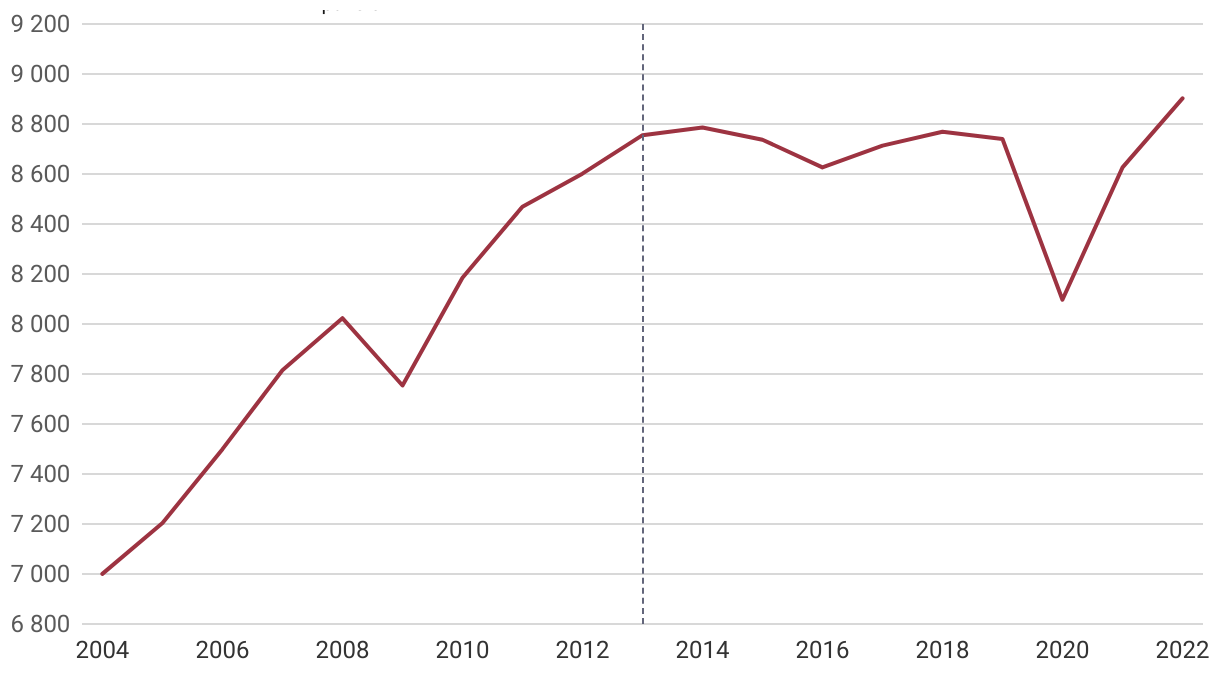 Gráfico de líneas que muestra la evolución del PIB per cápita en América Latina entre 2004 y 2022, medido en dólares constantes de 2015 y ponderado por población.