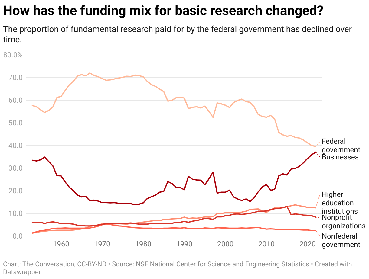 The proportion of fundamental research paid for by the federal government has declined over time.