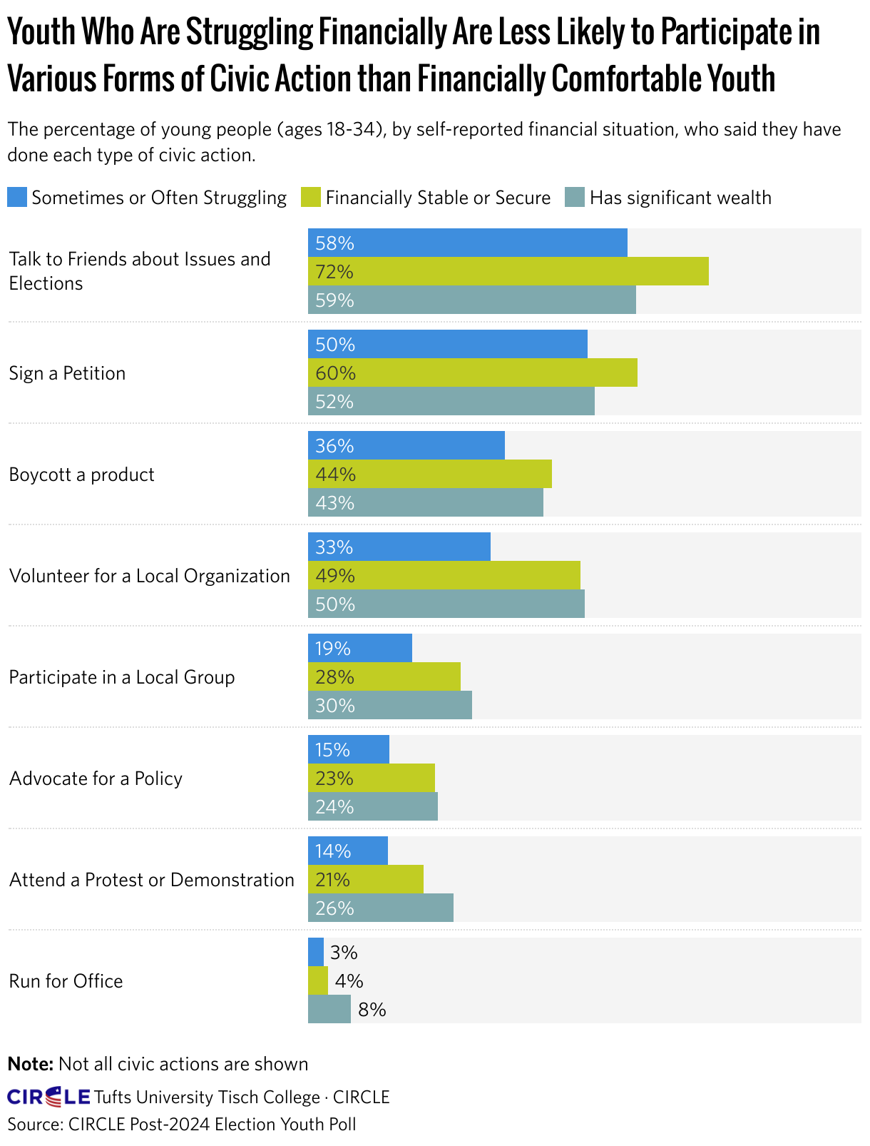 The percentage of young people (ages 18-34), by self-reported financial situation, who said they have done each type of civic action.