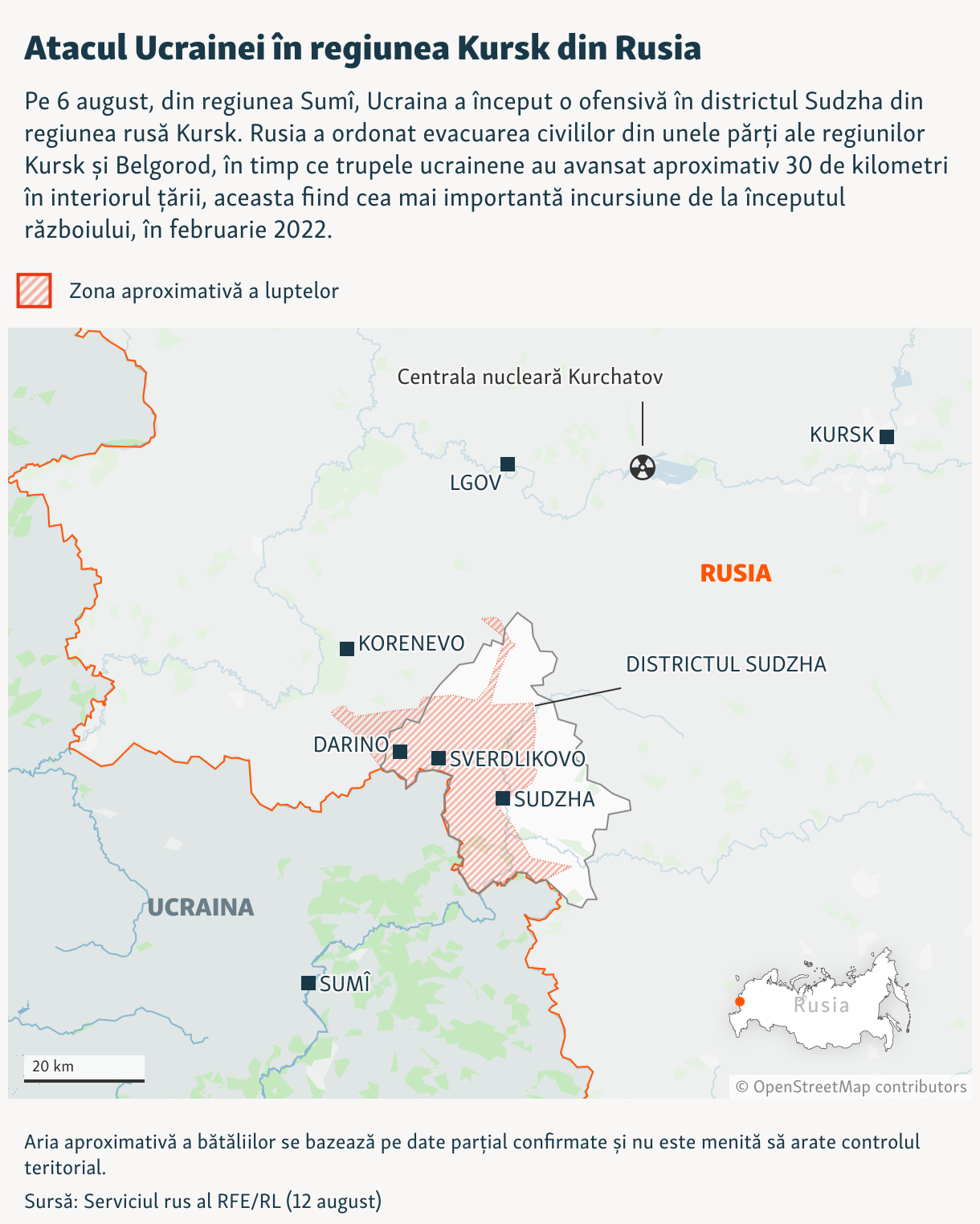 Pe 6 august, din regiunea Sumî, Ucraina a început o ofensivă în districtul Sudzha din regiunea rusă Kursk. Rusia a ordonat evacuarea civililor din unele părți ale regiunilor Kursk și Belgorod, în timp ce trupele ucrainene au avansat aproximativ 30 de kilometri în interiorul țării, aceasta fiind cea mai importantă incursiune de la începutul războiului, în februarie 2022.