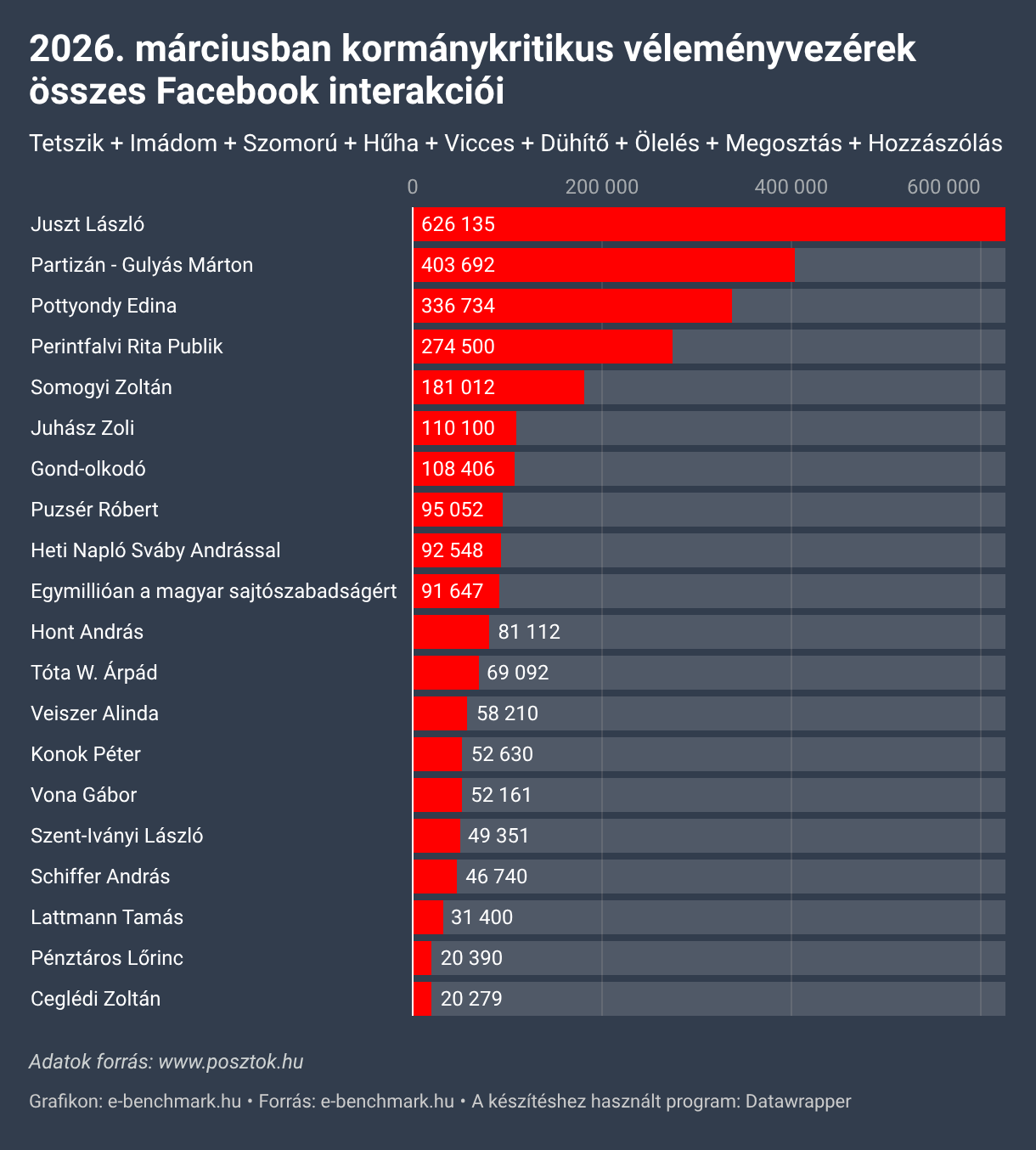 2026. márciusban kormánykritikus véleményvezérek összes Facebook interakciói