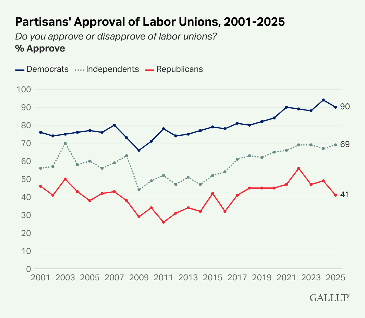 Line chart showing percentages of Democrats, independents and Republicans who approve of labor unions each year from 2001 through 2025. In 2025, 90% of Democrats, 69% of independents and 41% of Republicans approve of labor unions.