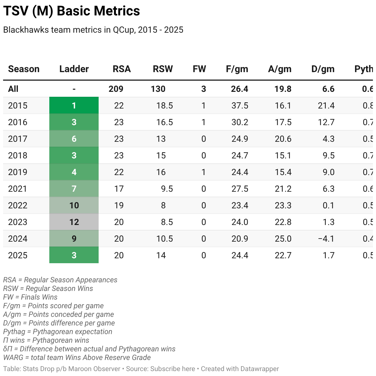 Blackhawks team metrics in QCup, 2015 - 2025