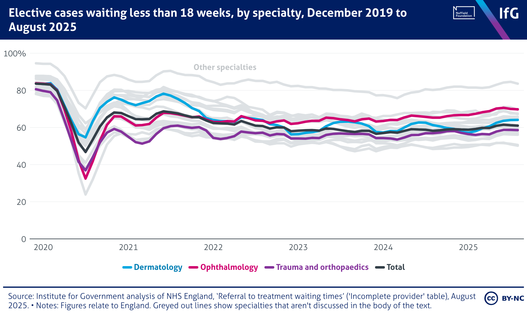 A line chart from the Institute for Government showing Elective cases waiting less than 18 weeks, by specialty, December 2019 to August 2025. The share of patients seen within 18 weeks dropped sharply in 2020 and only partially recovered. Trauma and orthopaedics consistently performed below the total average, while dermatology remained close to overall levels. Across all specialties, performance stabilised around 60% by 2025, well below pre-pandemic rates of over 80%.