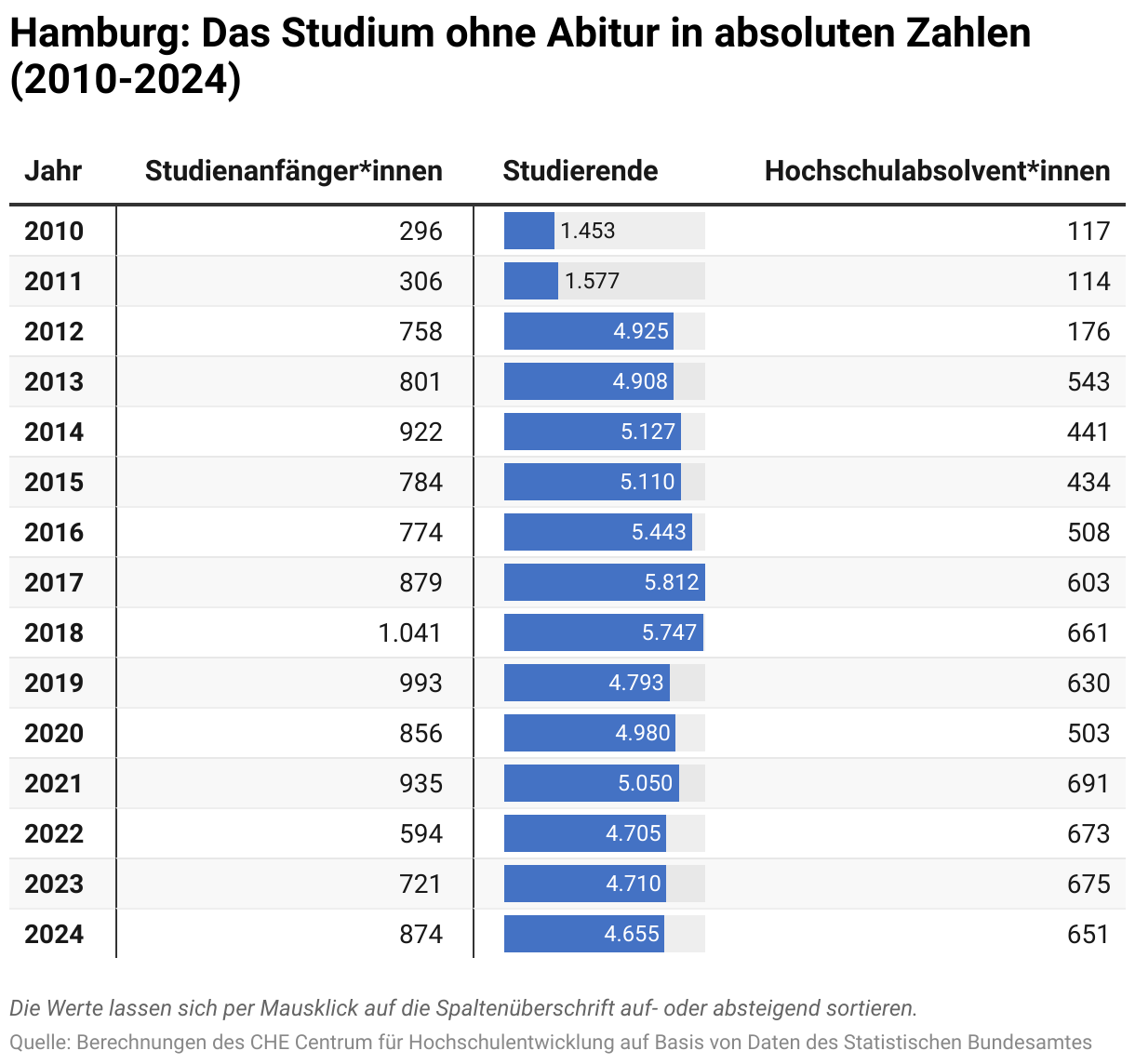 Hamburg: Das Studium ohne Abitur in absoluten Zahlen (2010-2024)