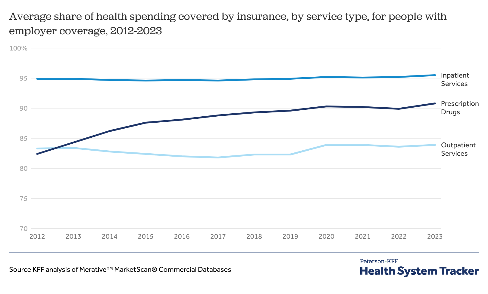 Average share of health spending covered by insurance, by service type, for people with employer coverage, 2012-2023