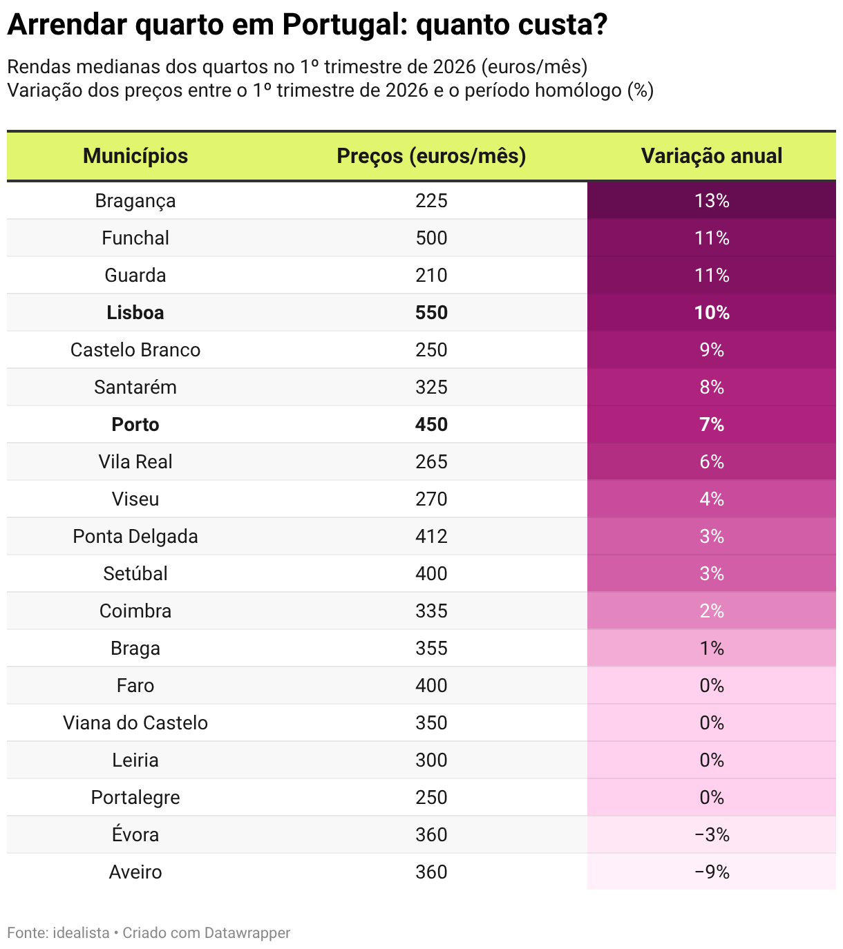 Rendas medianas dos quartos no 1º trimestre de 2026 (euros/mês) Variação dos preços entre o 1º trimestre de 2026 e o período homólogo (%)
