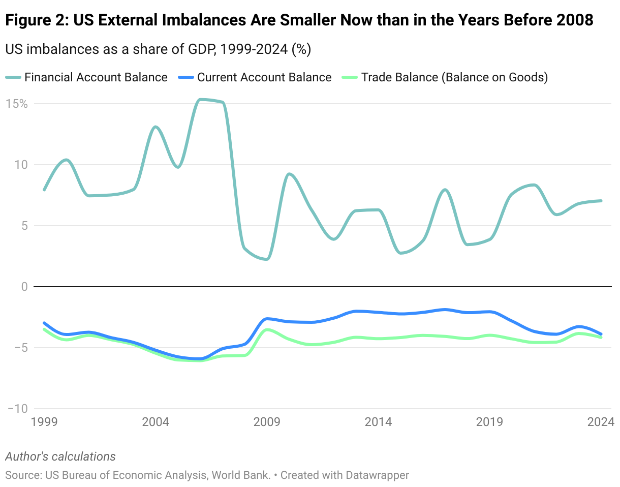 US imbalances as a share of GDP, 1999-2024 (%)