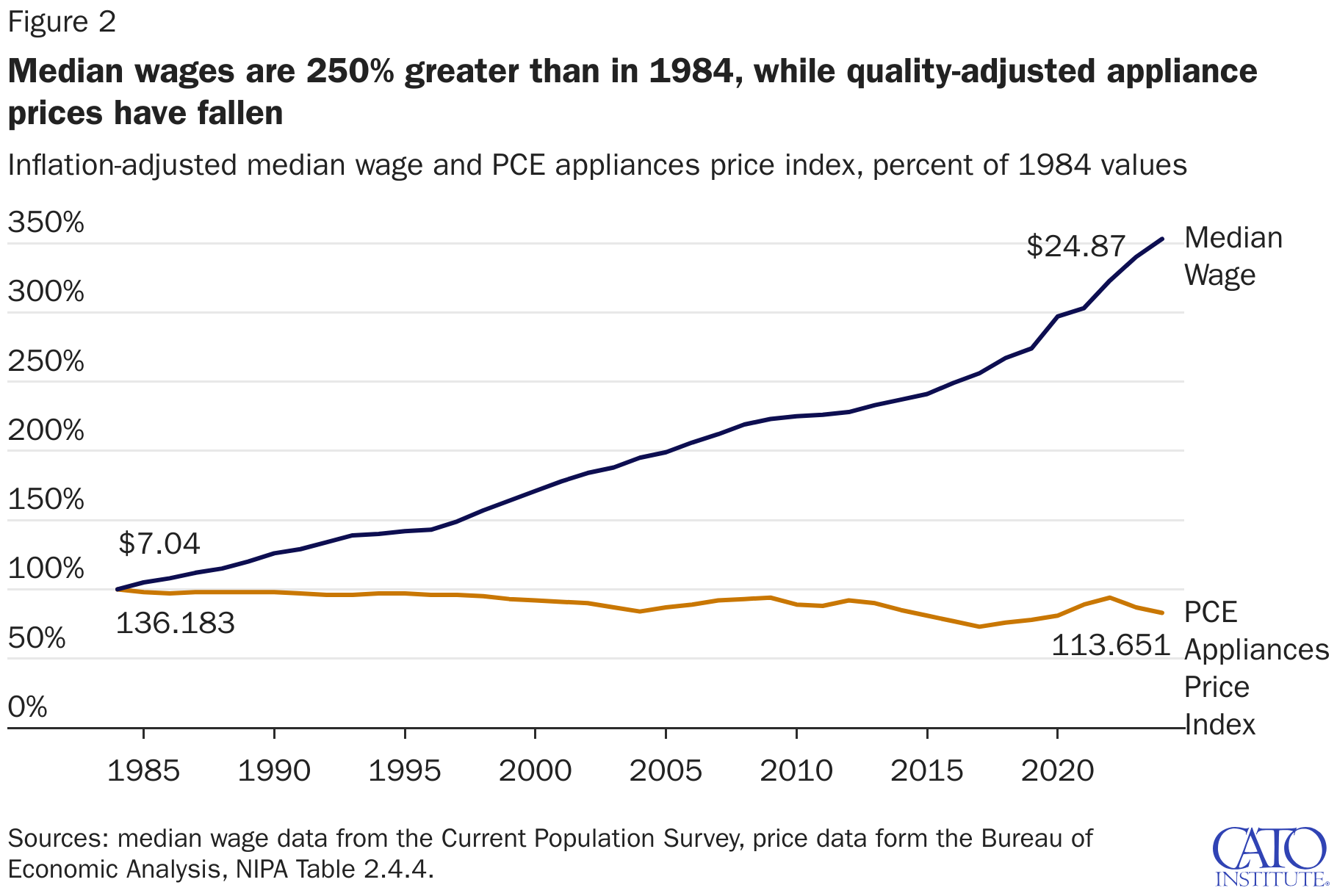 Inflation-adjusted median wage and PCE appliances price index, percent of 1984 values
