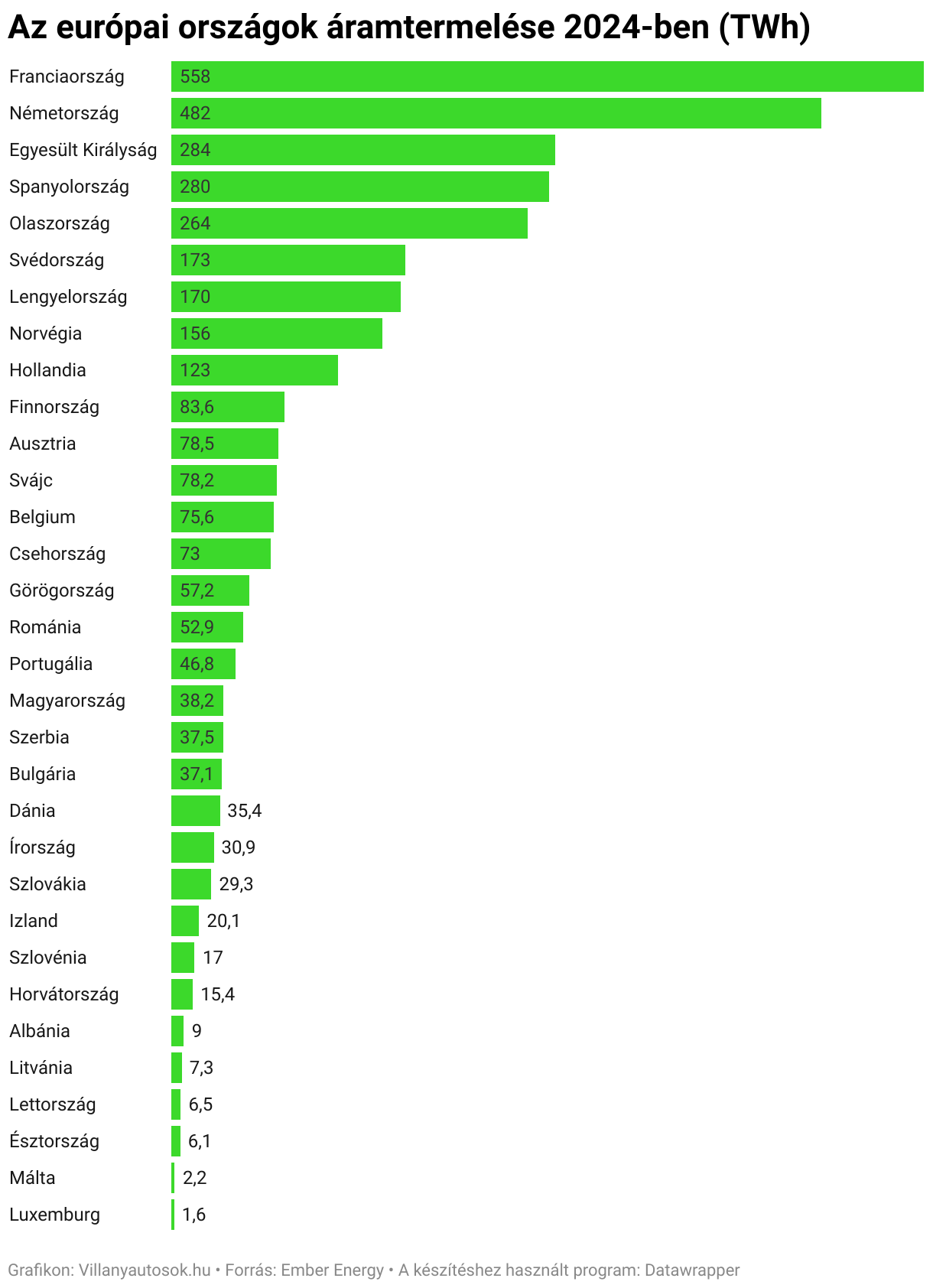 Az európai országok áramtermelése 2024-ben (TWh)