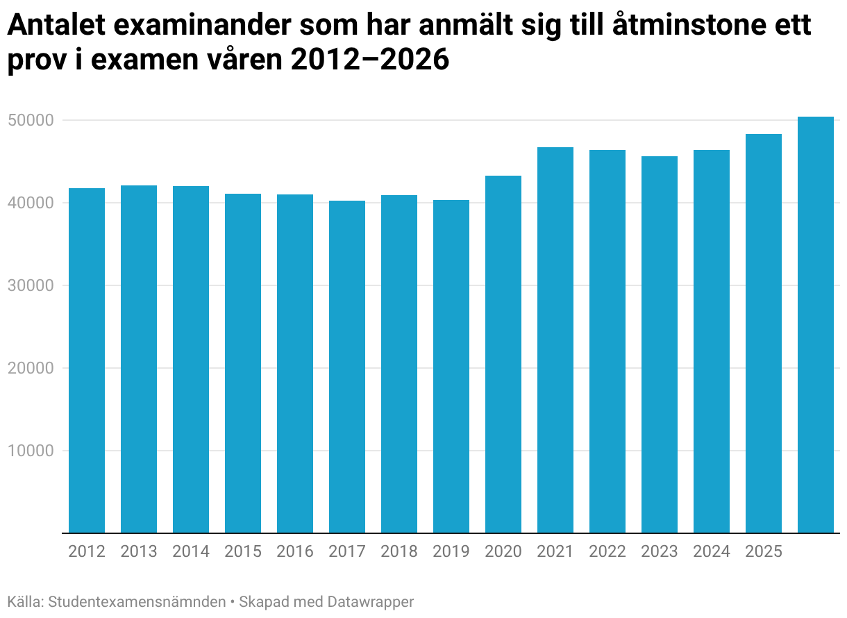 Antalet examinander som har anmält sig till åtminstone ett prov i examen våren 2012–2026