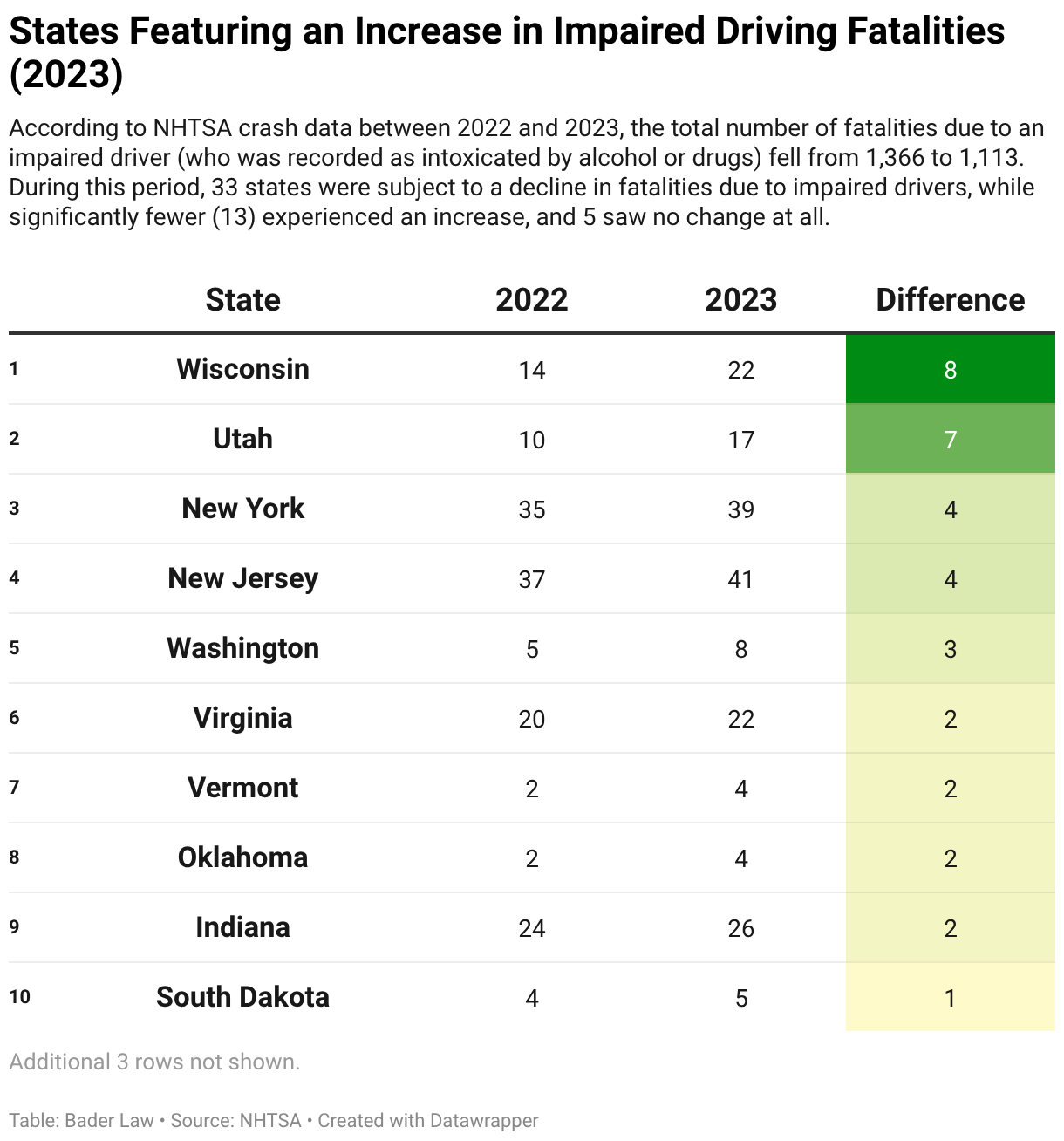 According to NHTSA crash data between 2022 and 2023, the total number of fatalities due to an impaired driver (who was recorded as intoxicated by alcohol or drugs) fell from 1,366 to 1,113. During this period, 33 states were subject to a decline in fatalities due to impaired drivers, while significantly fewer (13) experienced an increase, and 5 saw no change at all.