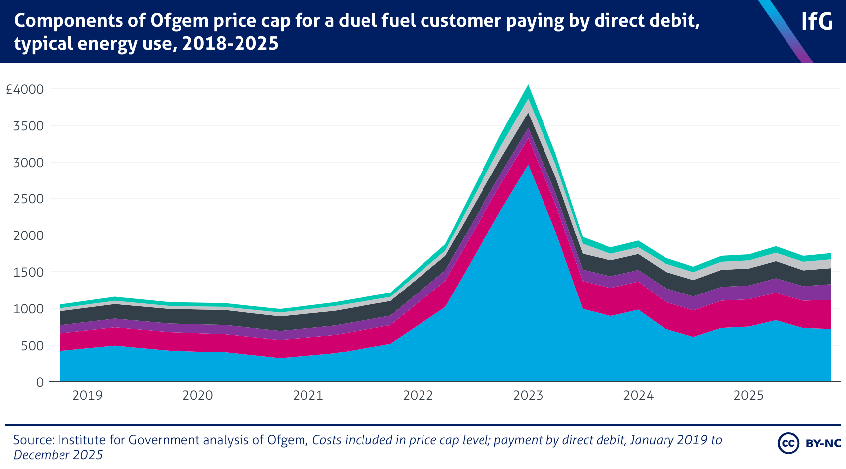 Components of Ofgem price cap for a duel fuel customer paying by direct debit, typical energy use, 2018-2025