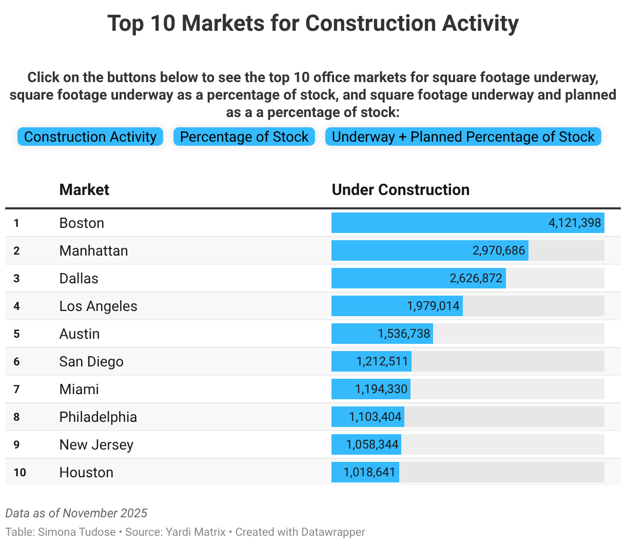 Click on the buttons below to see the top 10 office markets for square footage underway, square footage underway as a percentage of stock, and square footage underway and planned as a a percentage of stock: