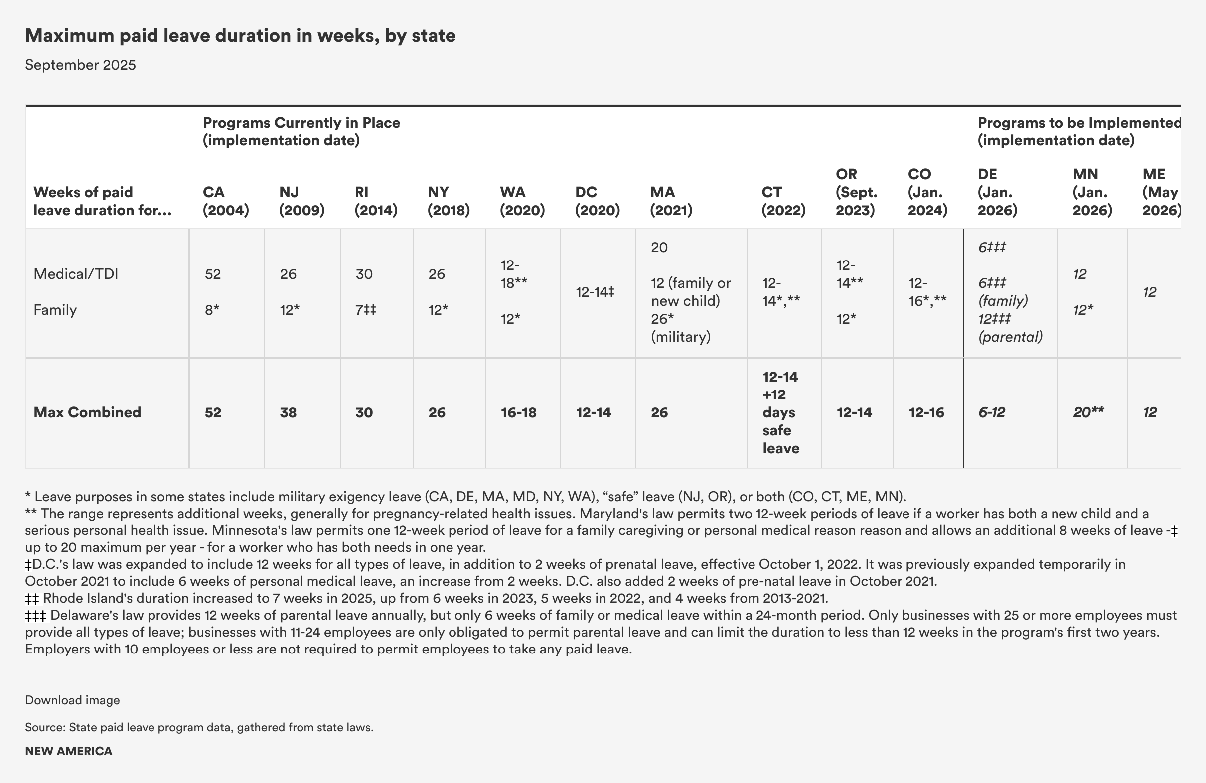 Table providing durations for paid medical, paid family or combined paid family and medical leave by state.