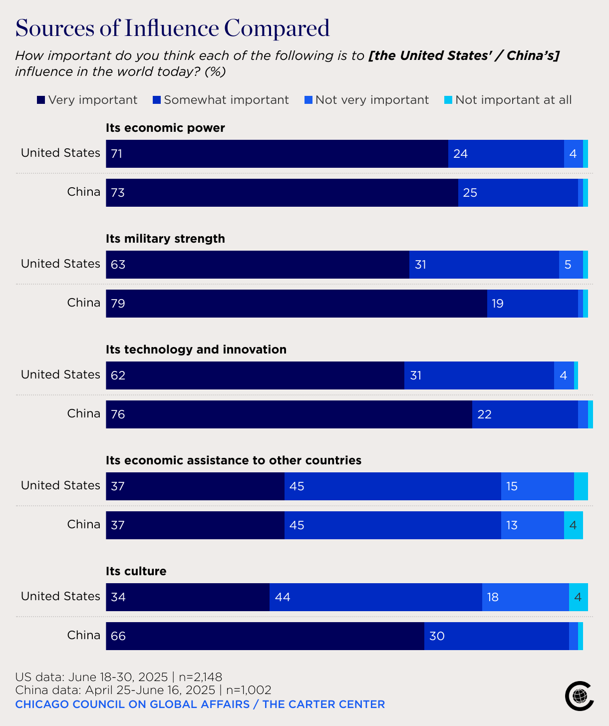 How important do you think each of the following is to [the United States' / China’s] influence in the world today? (%)