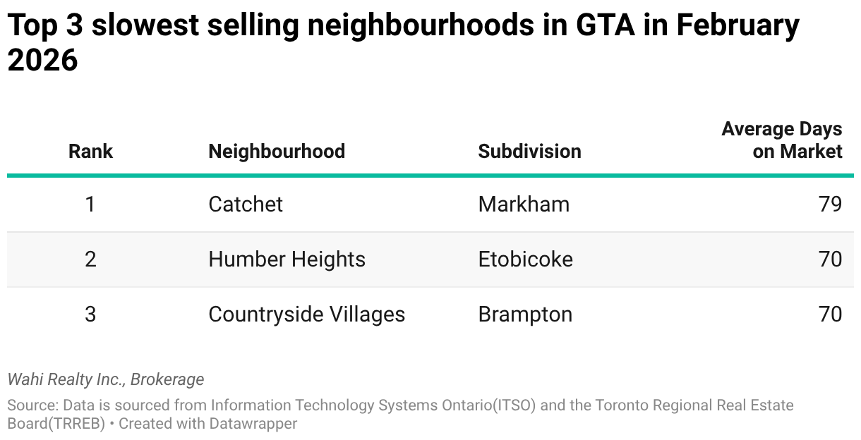 Top 3 slowest selling neighbourhoods in GTA in February 2026