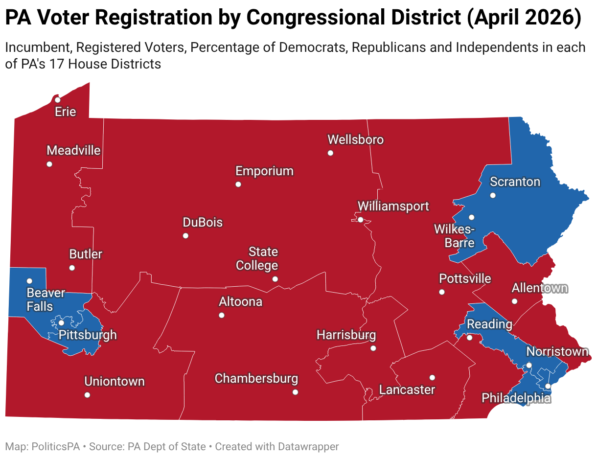 Incumbent, Registered Voters, Percentage of Democrats, Republicans and Independents in each of PA's 17 House Districts