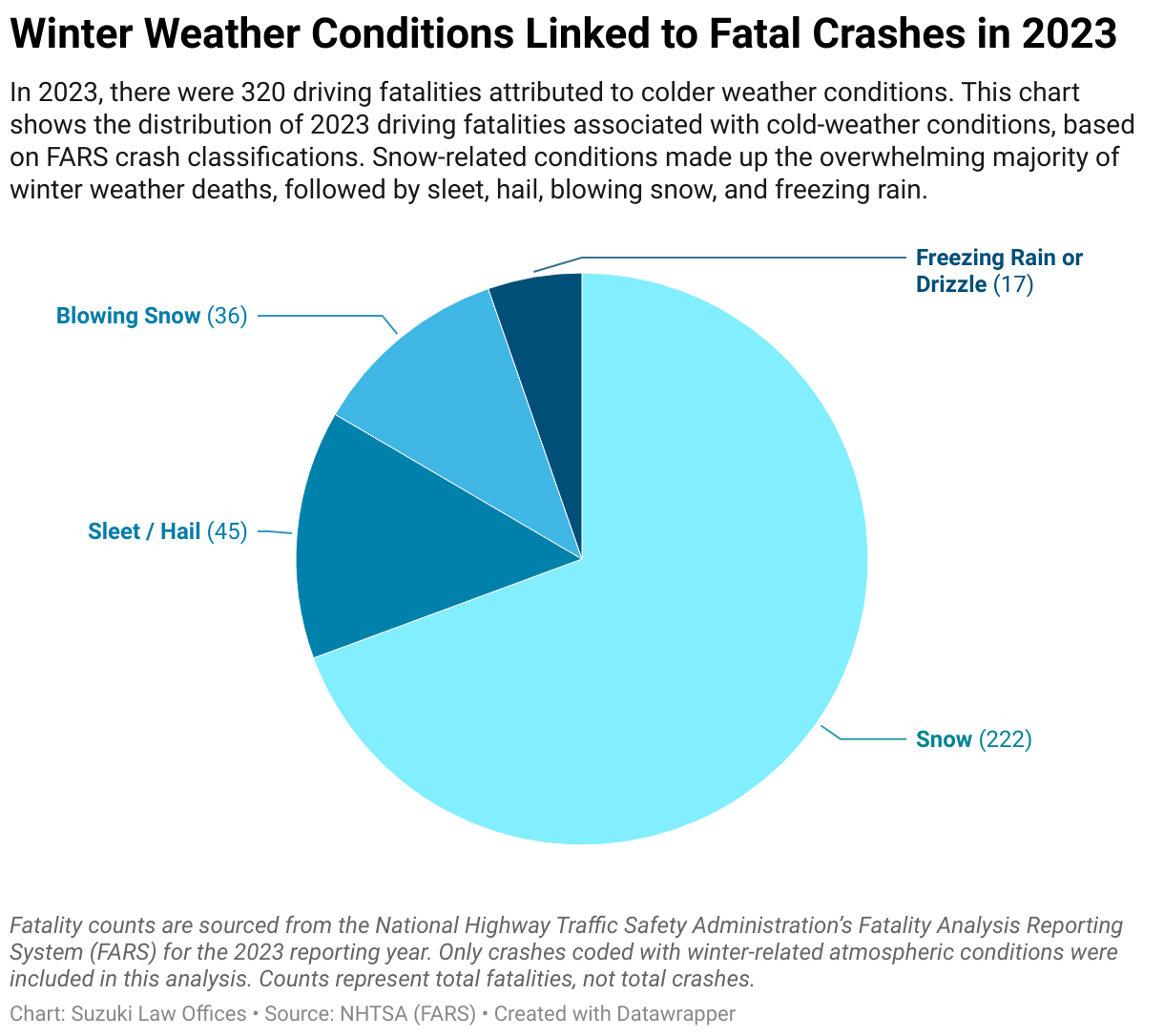 In 2023, there were 320 driving fatalities attributed to colder weather conditions. This chart shows the distribution of 2023 driving fatalities associated with cold-weather conditions, based on FARS crash classifications. Snow-related conditions made up the overwhelming majority of winter weather deaths, followed by sleet, hail, blowing snow, and freezing rain.