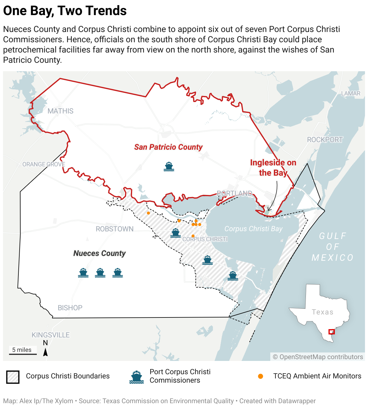 Nueces County and Corpus Christi combine to appoint six out of seven Port Corpus Christi Commissioners. Hence, officials on the south shore of Corpus Christi Bay could place petrochemical facilities far away from view on the north shore, against the wishes of San Patricio County.
