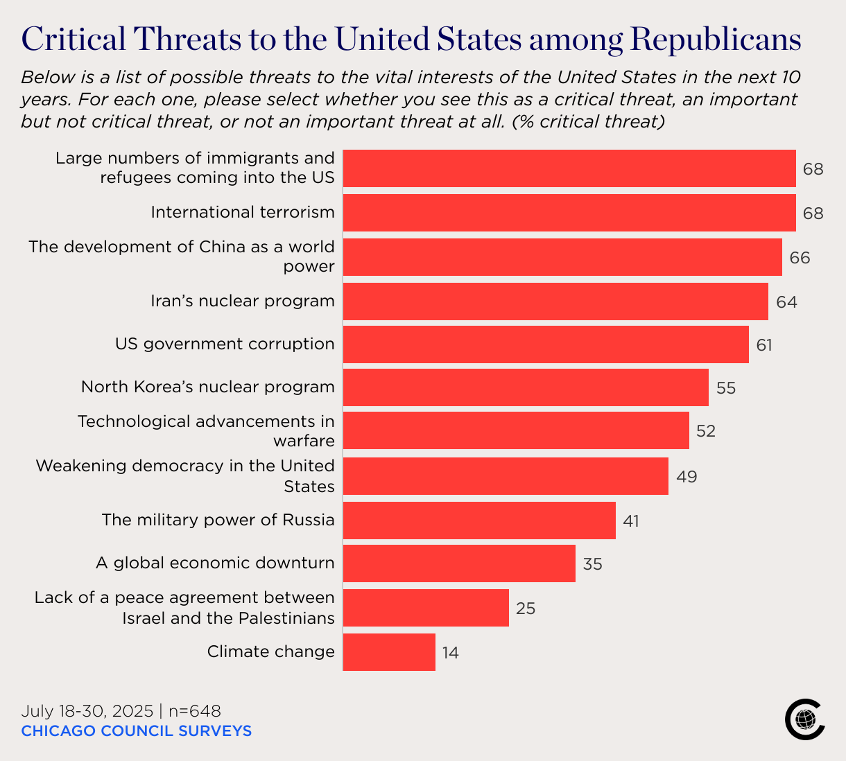 Below is a list of possible threats to the vital interests of the United States in the next 10 years. For each one, please select whether you see this as a critical threat, an important but not critical threat, or not an important threat at all. (% critical threat)