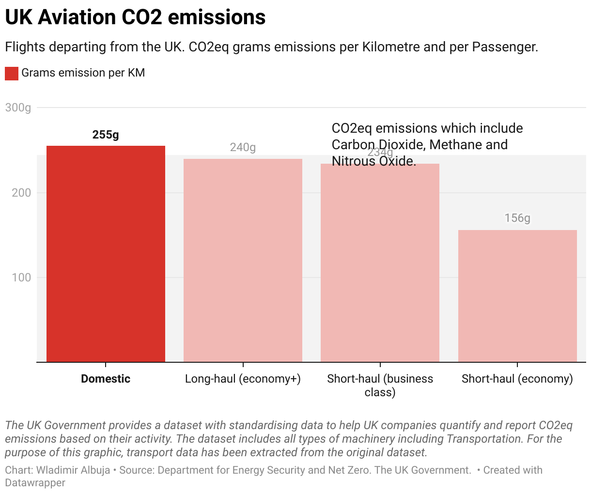 Flights departing from the UK. CO2eq grams emissions per Kilometre and per Passenger.