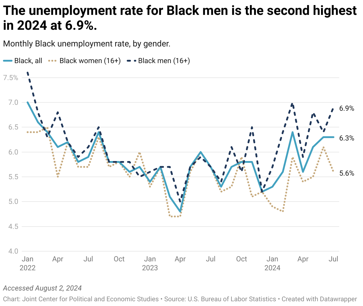 The unemployment rate for Black men is the second highest in 2024 at 6.9%.