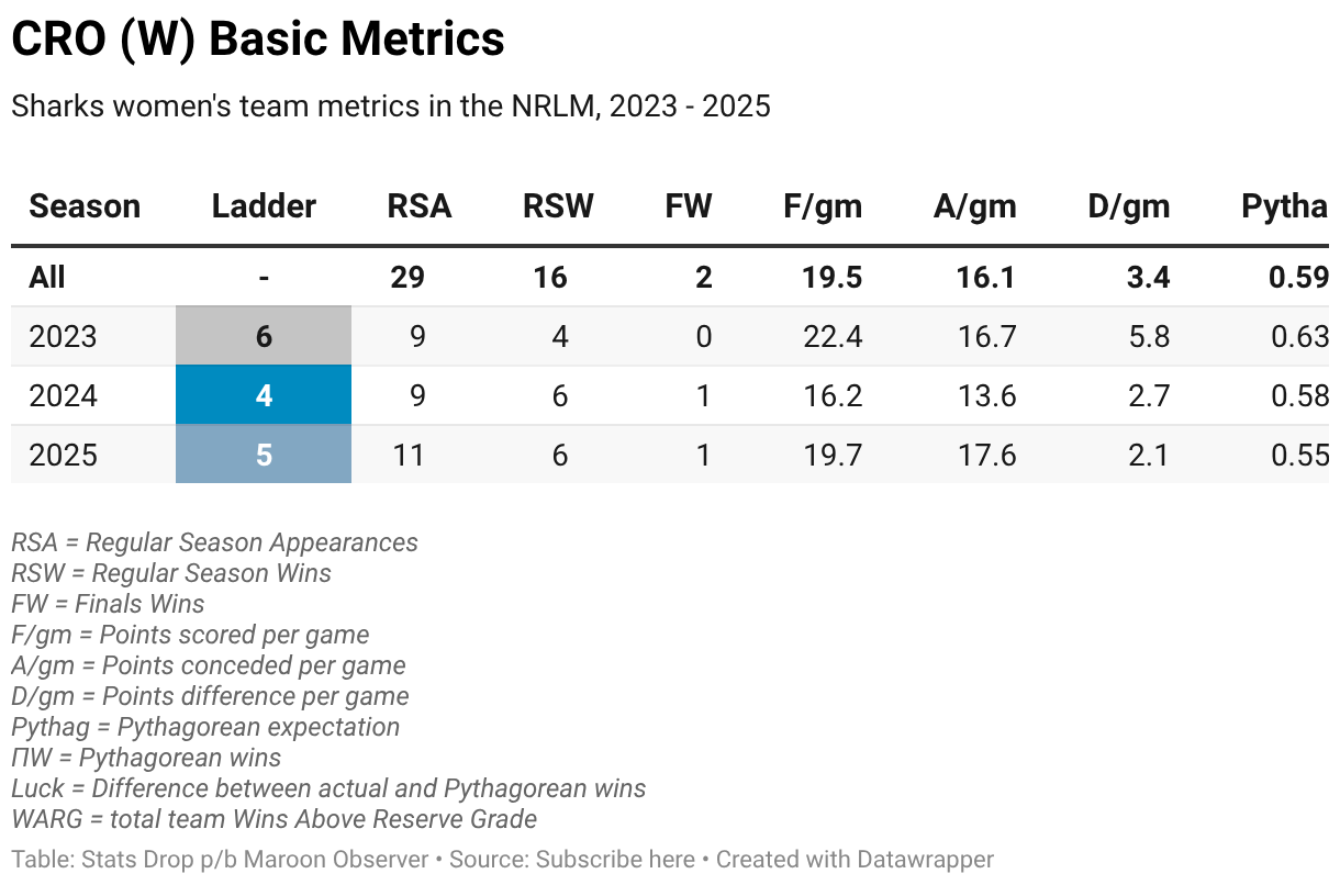 Sharks women's team metrics in the NRLM, 2023 - 2025
