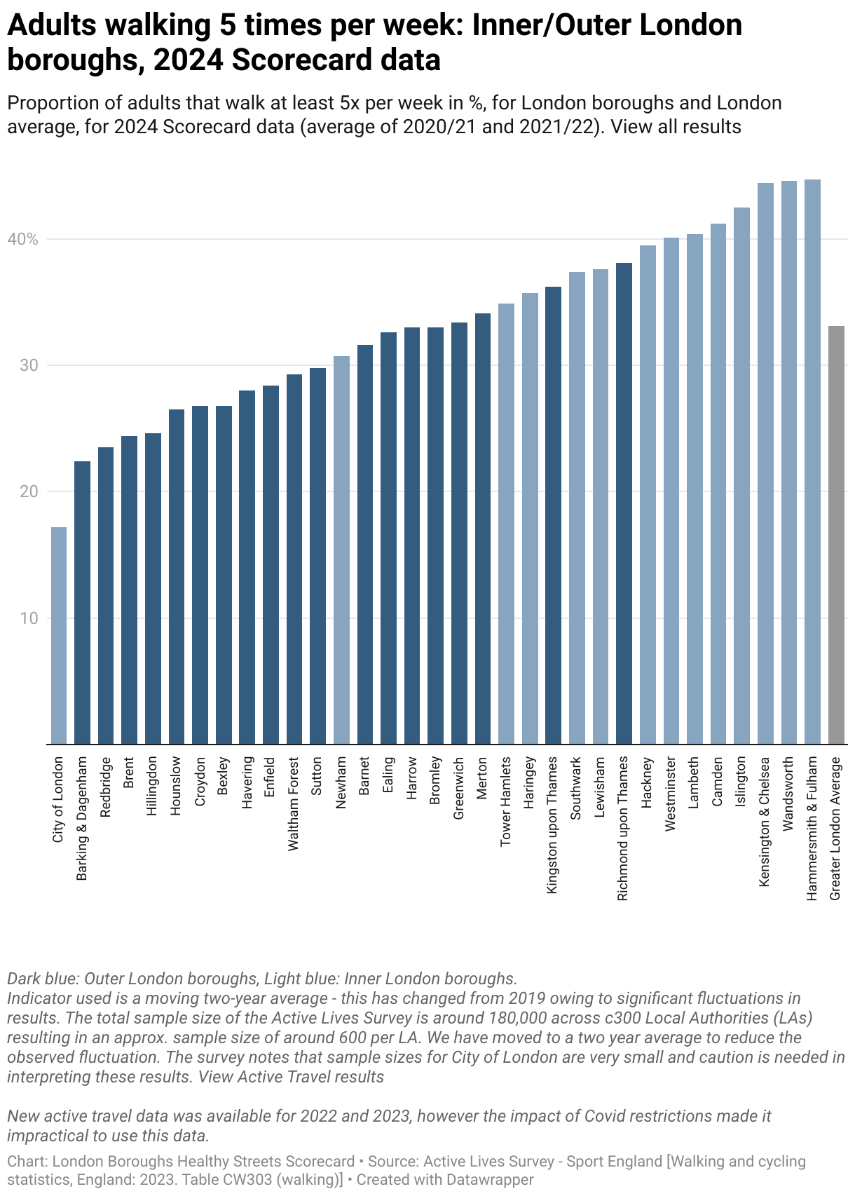 Adults walking 5 times per week: Inner/Outer London boroughs, 2024 Scorecard data
