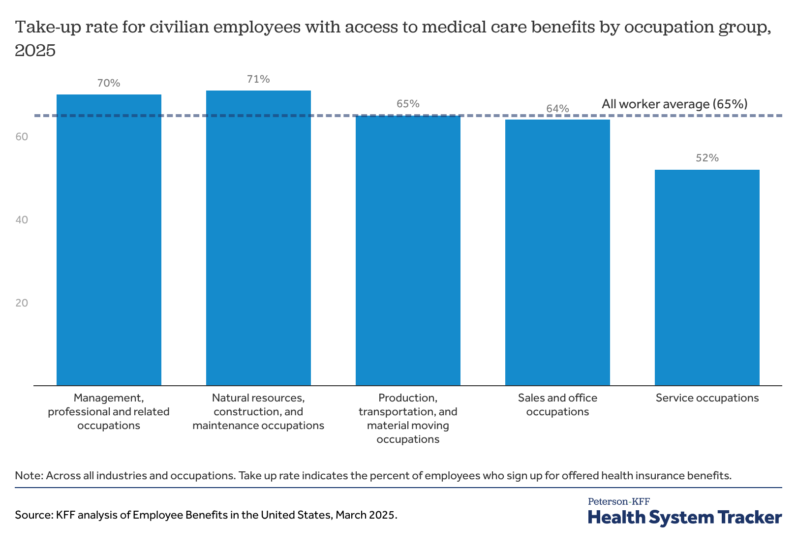 Take-up rate for civilian employees with access to medical care benefits by occupation group, 2025