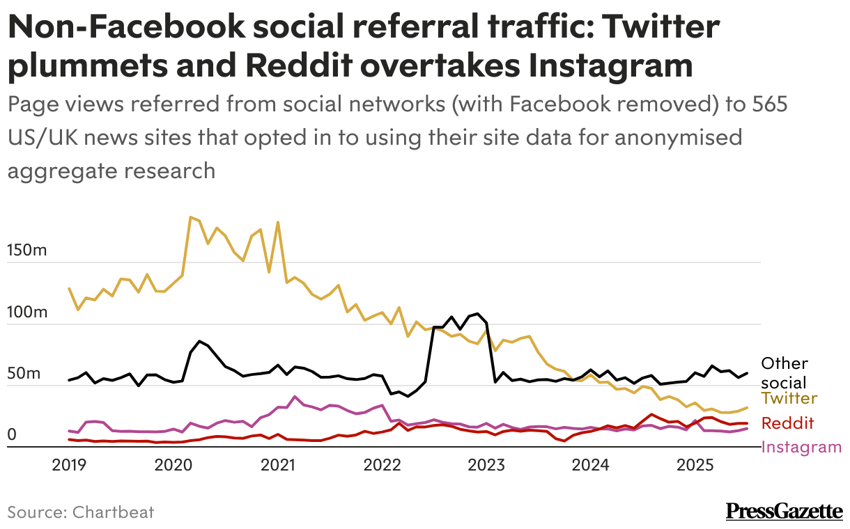 Page views referred from social networks (with Facebook removed) to 565 US/UK news sites that opted in to using their site data for anonymised aggregate research