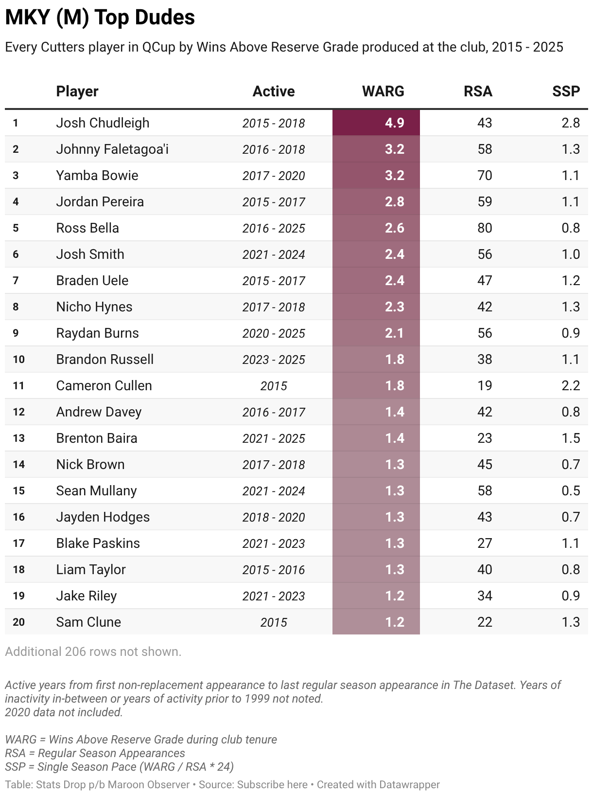 Every Cutters player in QCup by Wins Above Reserve Grade produced at the club, 2015 - 2025